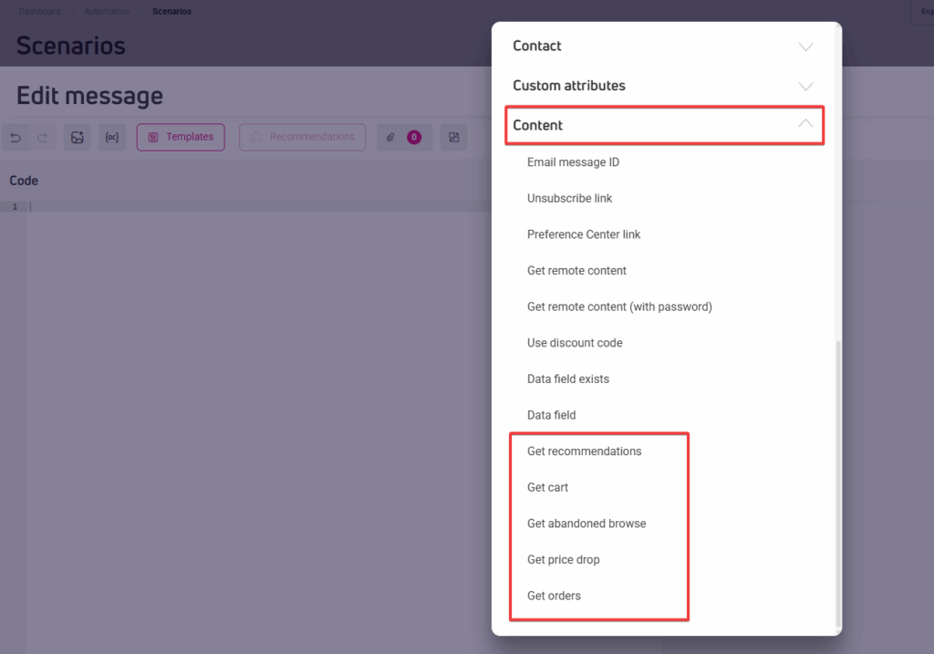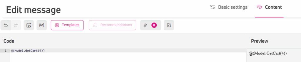 The code editor lets you pull live product data into your contents using Razor syntax. Depending on what you want to show – recommendations, cart contents, recently viewed products, price drops, or order details – each method returns a list of products and the store currency.