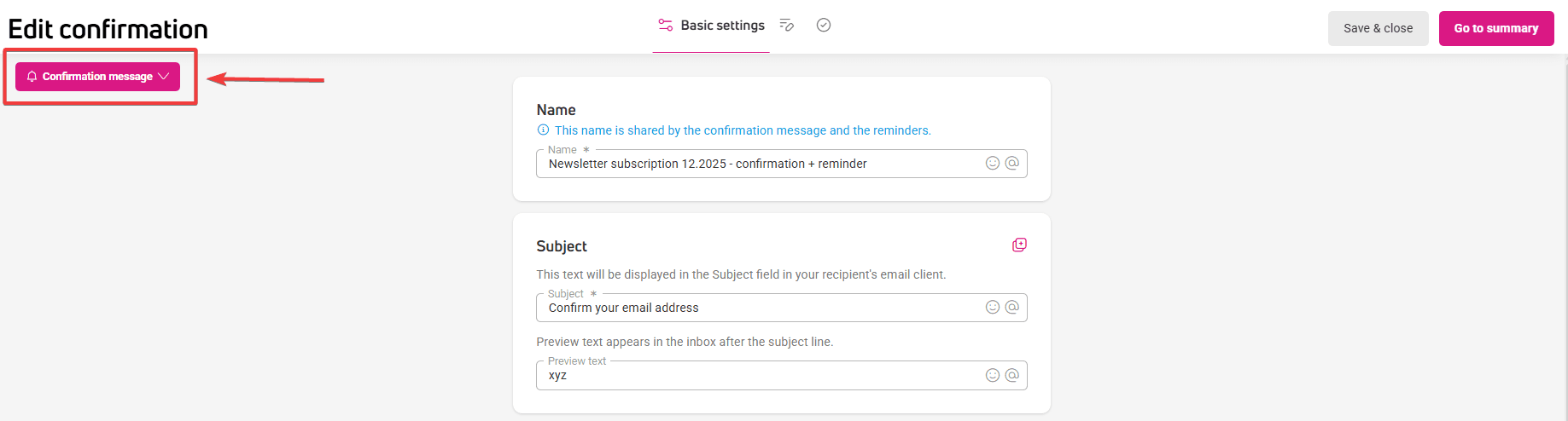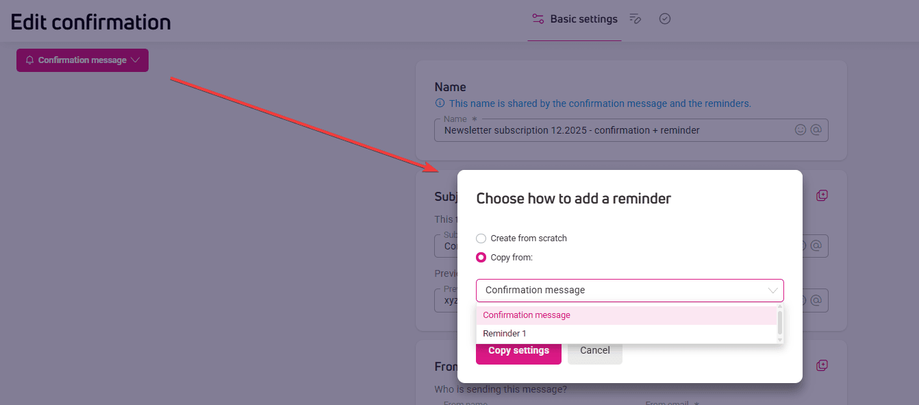 - A shared name for confirmation and its reminders. This name appears in the table under Settings > Consent > Confirmations.