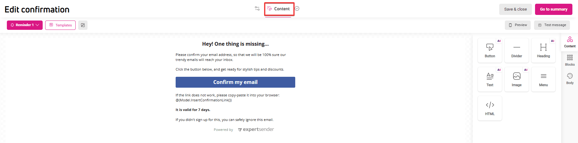 - Next, create the reminder content. Make sure to include a confirmation link in the message, for example under a button.