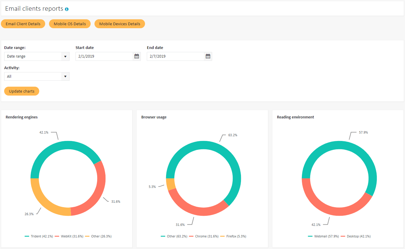 The basic report displays three charts, which provide basic statistical information on the rendering engines used to render your messages (Trident/WebKit and other), browsers in which they are opened (Chrome/Firefox/Safari/Internet Explorer/Edge and other), and the reading environment (Webmail/Desktop/Mobile).