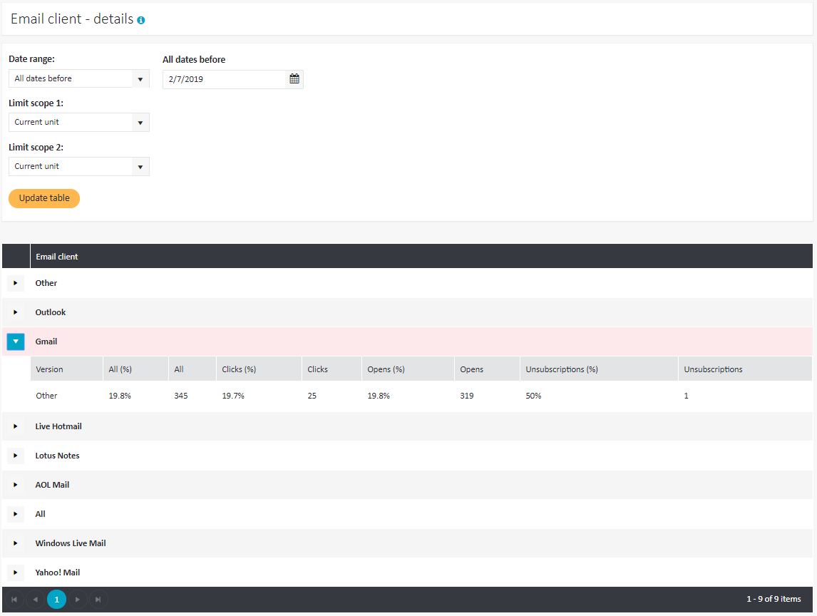 The table in Email Client Details provides detailed analytics on the clients used to open your messages, paired with statistics on clicks, opens, and unsubscriptions generated by each client: