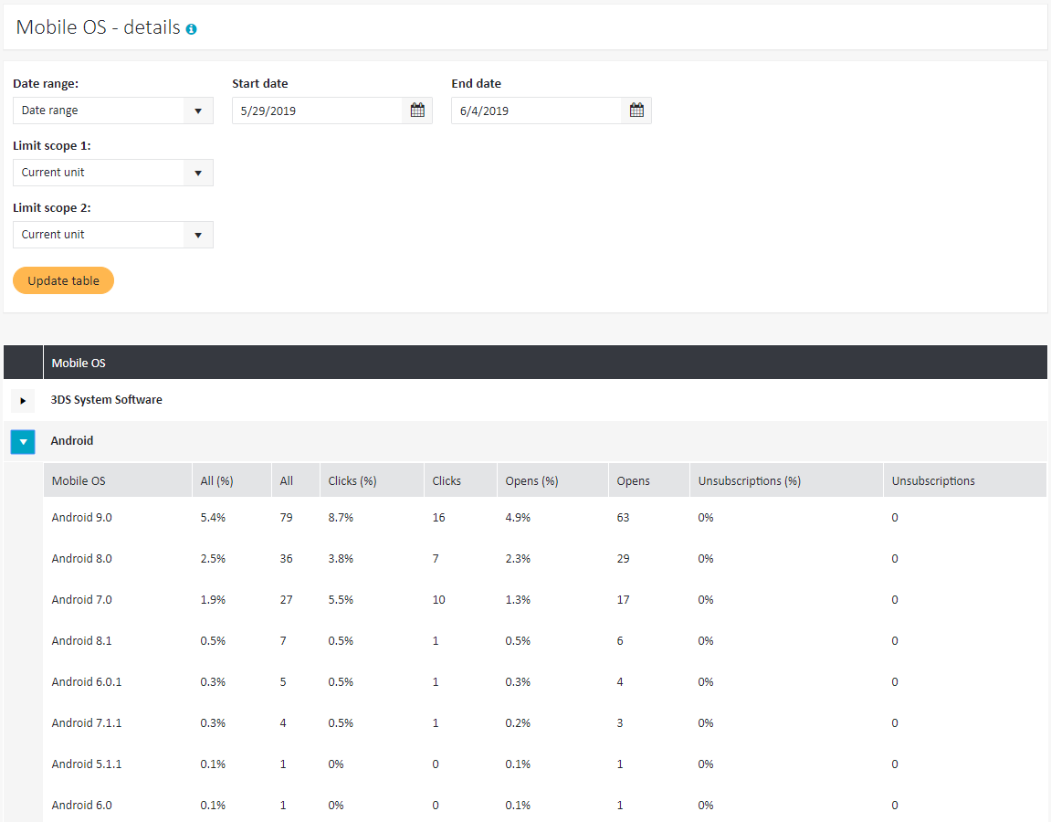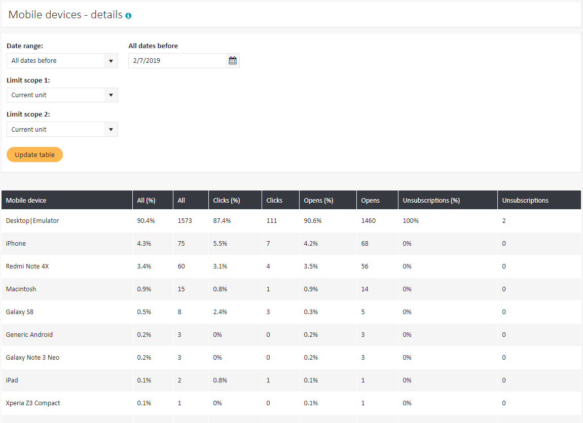 The table in Mobile Devices Details contains data on which mobile devices and with what frequency your messages are opened, with information on clicks, opens, and unsubscriptions taking place on each device.