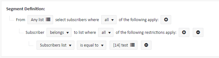 In the following situation the segment will find the subscribers who belong to the “test” list but simultaneously these subscribers may also be present on the other lists. In effect some of the subscribers can be pulled from the other lists instead of the “test” list only.