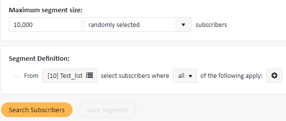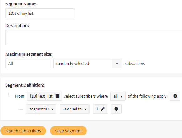 - Go to Subscribers > Segments and click Create new segment. For the “10%” group of subscribers you need to define a segment with a single restriction: “segmentID equal to 1″. You can give it a name such as “10% of my list”.