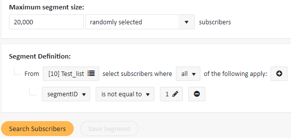 - When creating segments for “30%” and “40%” you need to follow the guidelines outlined above for creating the “20%” segment, but remember to add corresponding field restrictions to eliminate the previously tagged subscribers: “segmentID is not equal to 1″, “segmentID is not equal to 2″, “segmentID is not equal to X”, etc.
