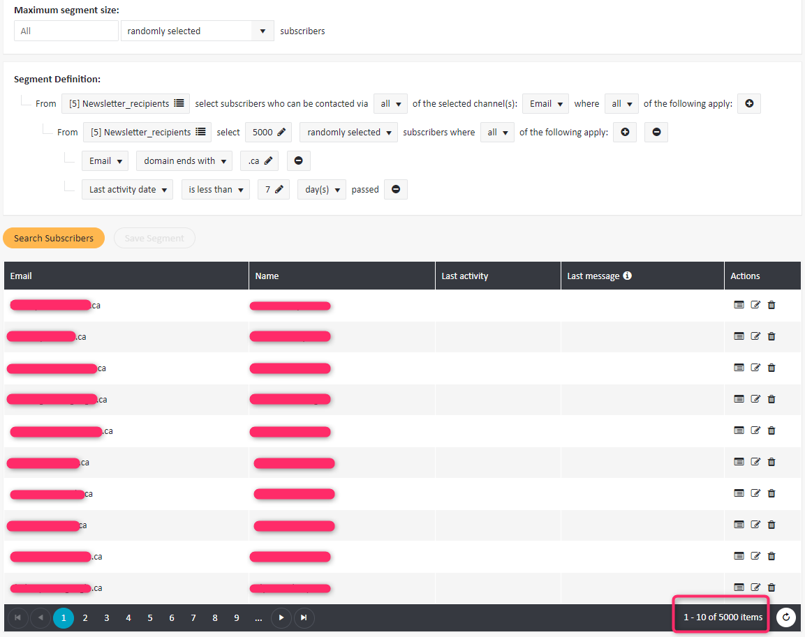 This is because the system first searched for random 5000 Canadian email addresses. Next it analyzed those 5000 email addresses and pulled the ones whose last activity date was processed in the last 7 days. So in this example every time the system could display a different selection of subscribers (spanning from 0 to 5000) because the last activity date restriction was not added directly to the operand with size limit.