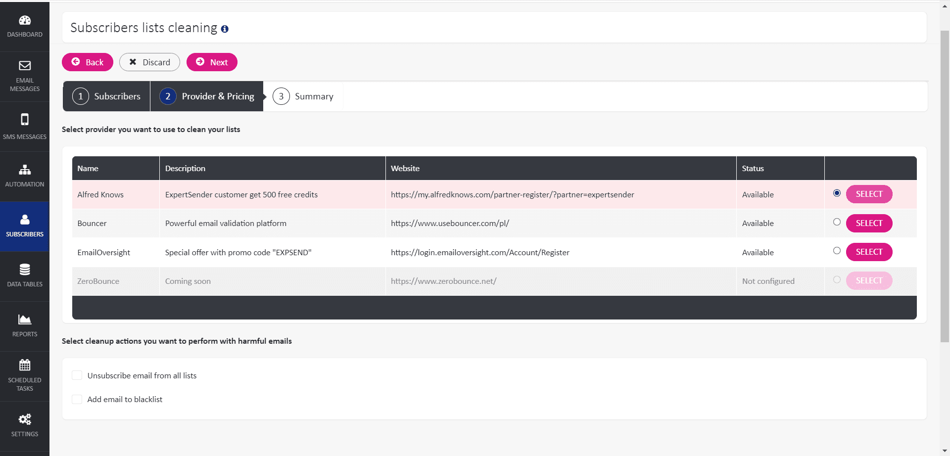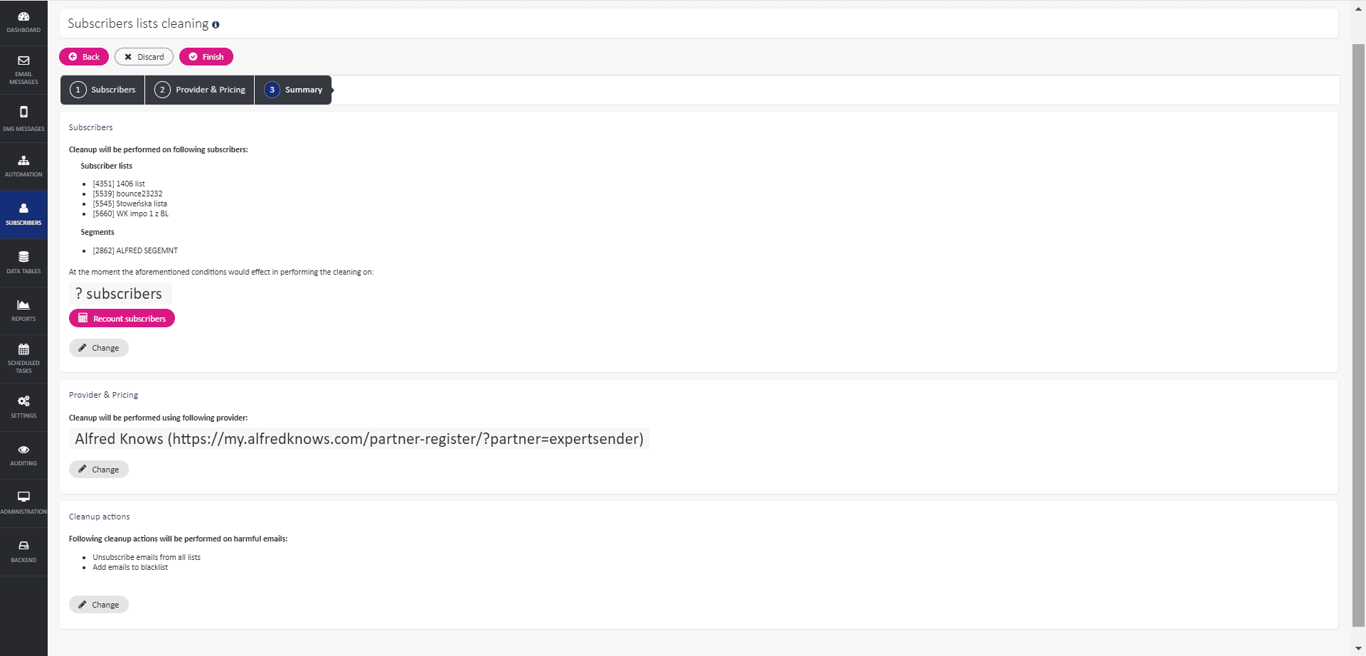 ExpertSender offers an advanced email list cleaning mechanism that utilizes several external systems to ensure the highest quality and deliverability of email campaigns. By integrating with EmailOversight, Alfred Knows and Bouncer, ExpertSender efficiently cleans email lists and segments, providing accurate and up-to-date email addresses. Users can decide what to do with harmful emails.