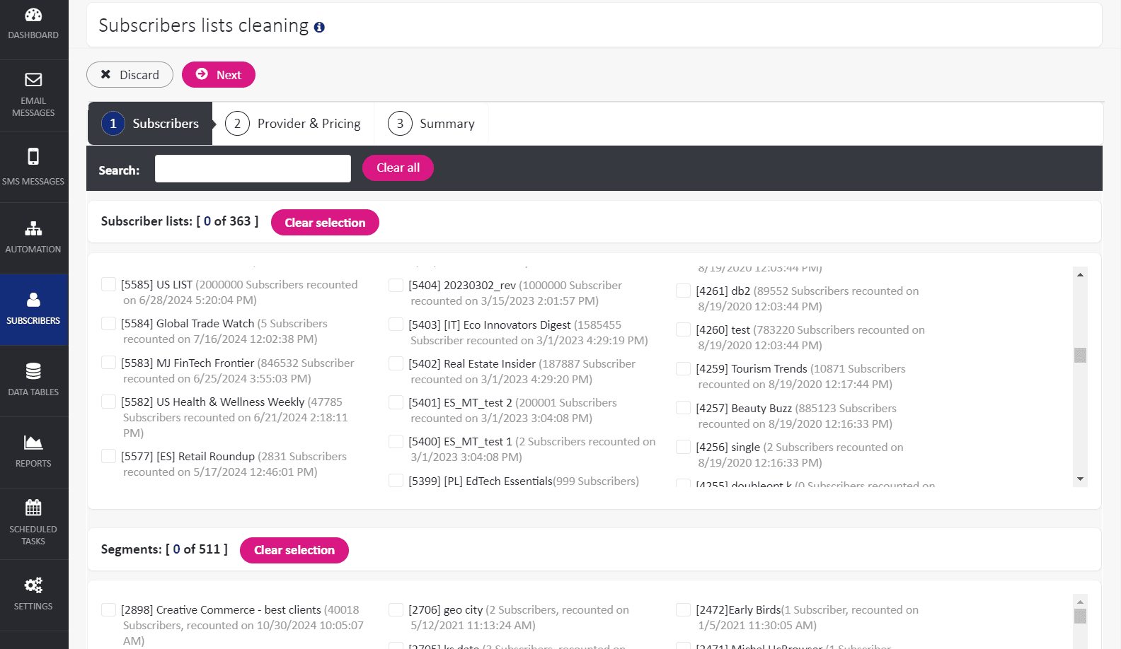 - Select the lists/ segments (max 10) to clean. At least one list or segment is required