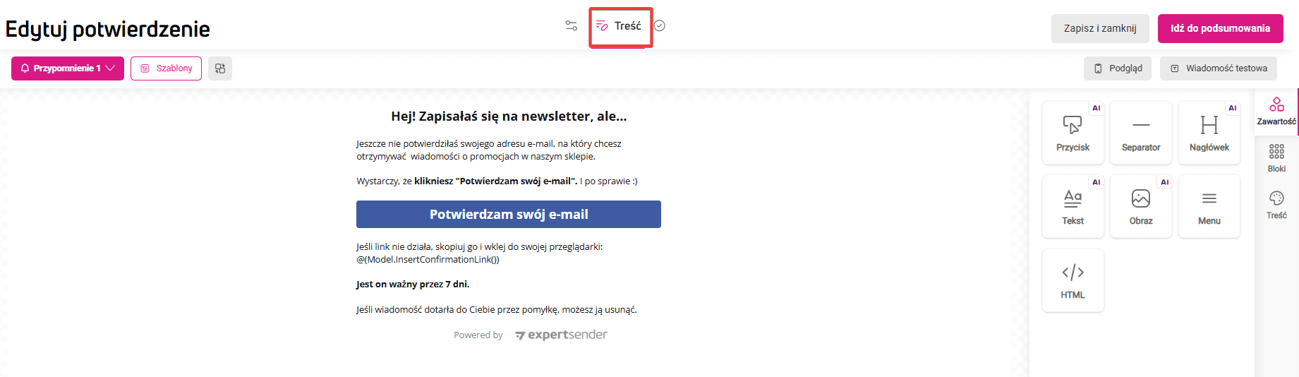 6. Następnie stwórz treść przypomnienia. Zwróć uwagę na to, aby w treści dodać link potwierdzający, np. pod przyciskiem.