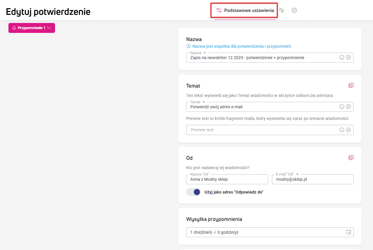 Sugerujemy ustawienie pierwszego przypomnienia po 24-48 godzinach od wysłania wiadomości z potwierdzeniem. To optymalny czas, ponieważ zapis jest wciąż świeży w pamięci odbiorcy, a jednocześnie dajesz mu wystarczająco dużo czasu na reakcję.