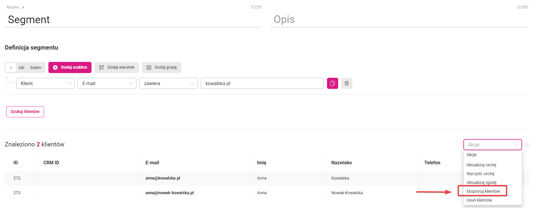 Eksport klientów z wybranego segmentu za pomocą opcji 'Akcje’