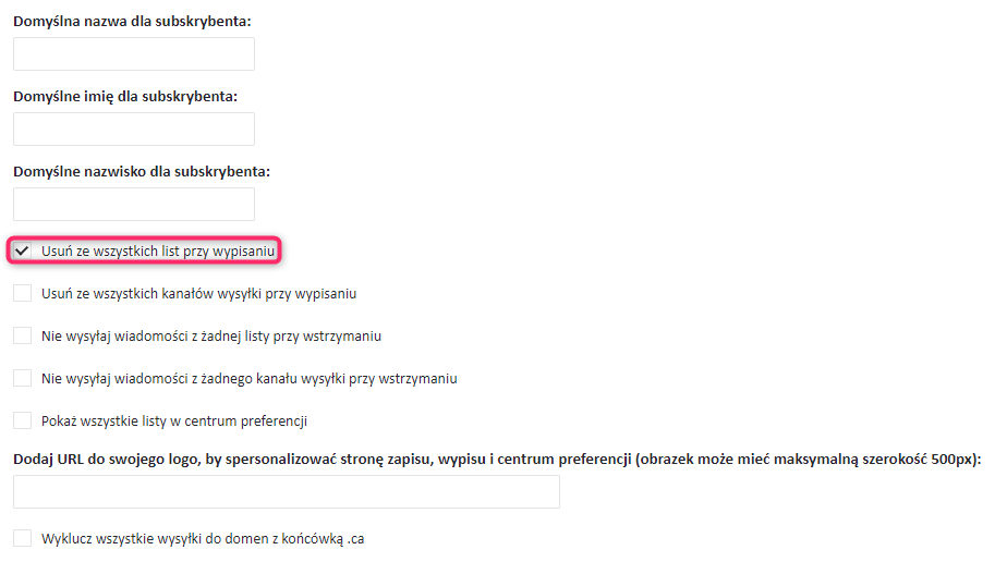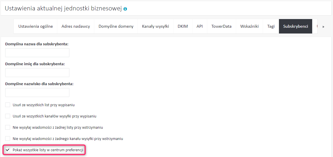 Stąd też, gdy subskrybent wyrazi swą chęć wypisu, warto wypisać go ze wszystkich list naraz. Wybierz Ustawienia > Jednostka biznesowa > Subskrybenci i zaznacz pole Usuń ze wszystkich list przy wypisaniu.