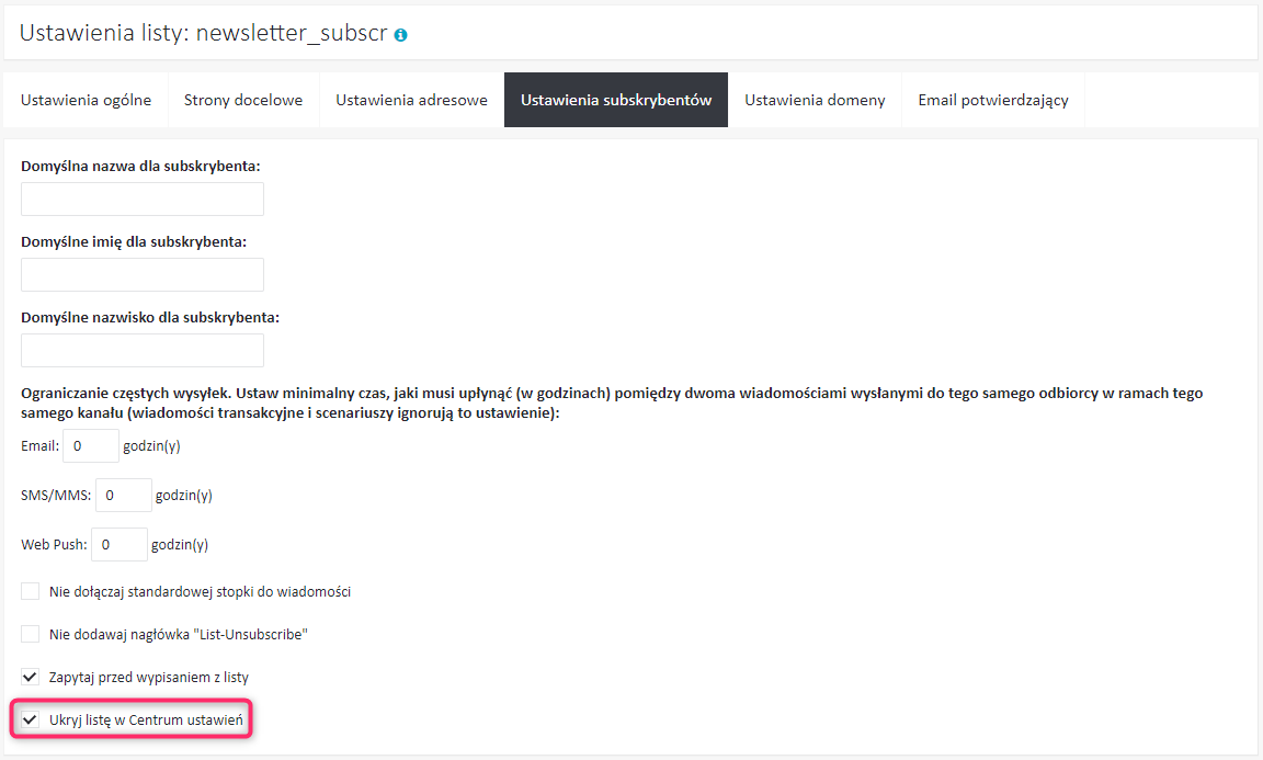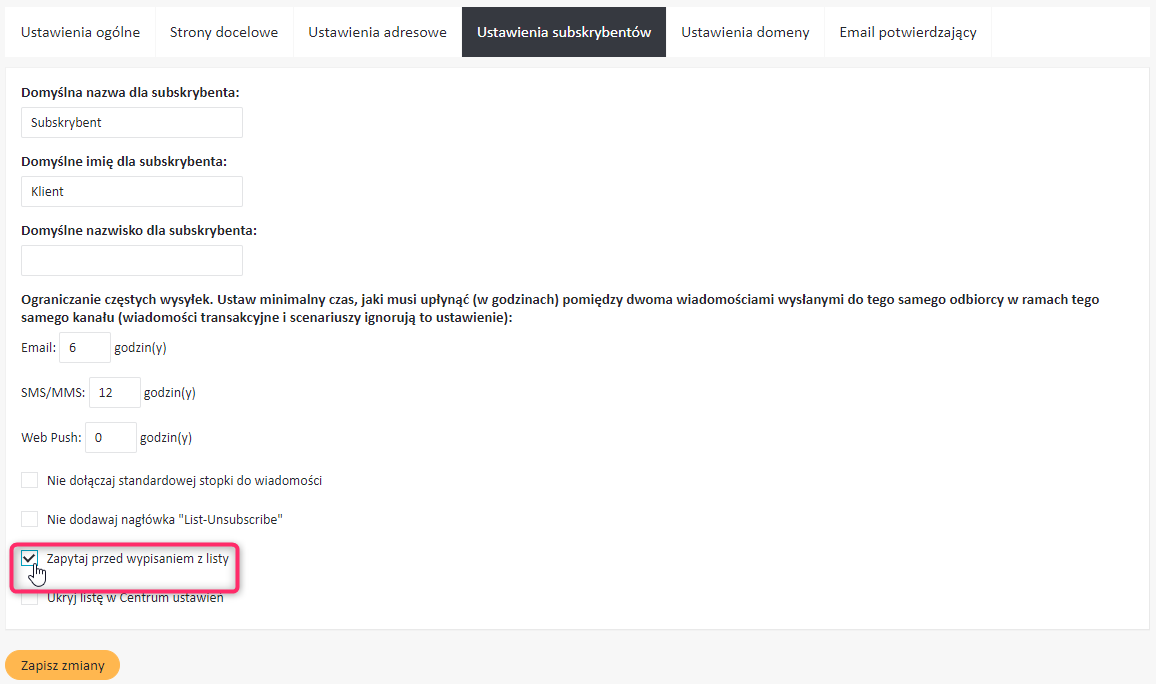 Sposób działania linku wypisu jest ustalany oddzielnie dla każdej listy. By wybrać tryb wypisu po jednym kliknięciu, w ustawieniach listy wybierz zakładkę Ustawienia subskrybentów oraz odznacz opcję Zapytaj przed wypisaniem z listy.