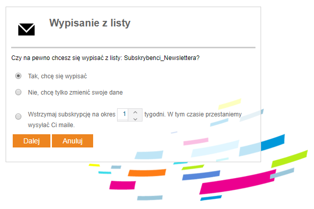 Domyślna opcja pozwala użytkownikowi na aktualizację danych, zawieszenie subskrypcji na okres od 1 do 52 tygodni oraz natychmiastowy wypis. Przy wyborze odpowiedzi użytkownik może także podać powód wypisu.