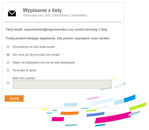 Po wypisie użytkownik jest domyślnie przekierowywany na stronę systemową ExpertSender, dzięki której możesz poznać powód wypisu użytkownika: