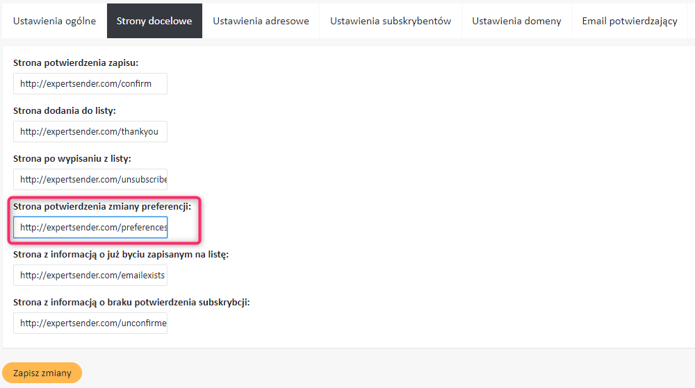 - Wprowadź link do centrum ustawień w polu Strona potwierdzenia zmiany preferencji.