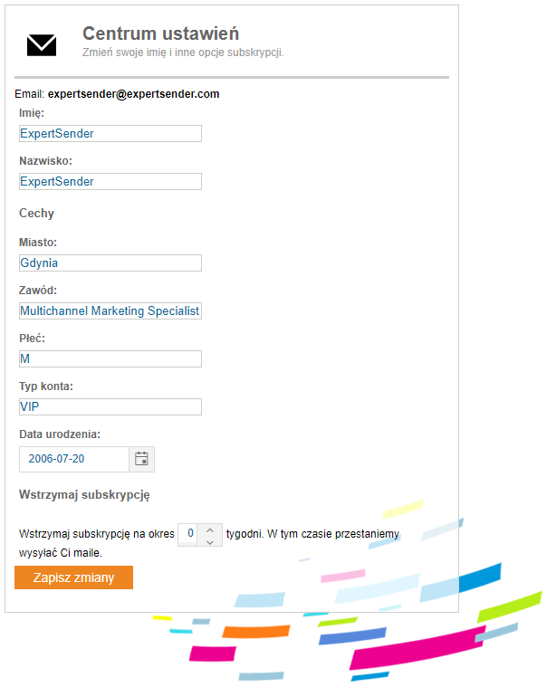 Centrum ustawień to strona, na której Twoi subskrybenci mogą zaktualizować swoje dane osobowe lub zawiesić swoją subskrypcję. Wszystkie zmiany dokonywane przez subskrybenta na tej stronie są automatycznie zapisywane na platformie.