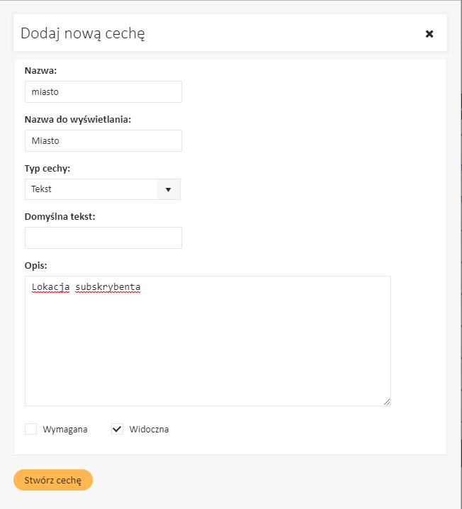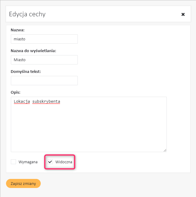 Jeśli chcesz, aby w centrum ustawień widoczna była dodatkowa cecha, musisz nadać jej status widocznej. If you want an additional custom field to appear on the page of the preference center, you need to make it visible. By nowa cecha miała status widocznej, zaznacz pole Widoczna podczas jej tworzenia: