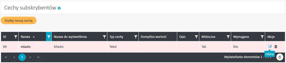 - Znajdź cechę, którą chcesz uczynić widoczną oraz w kolumnie Akcje wybierz Edytuj.