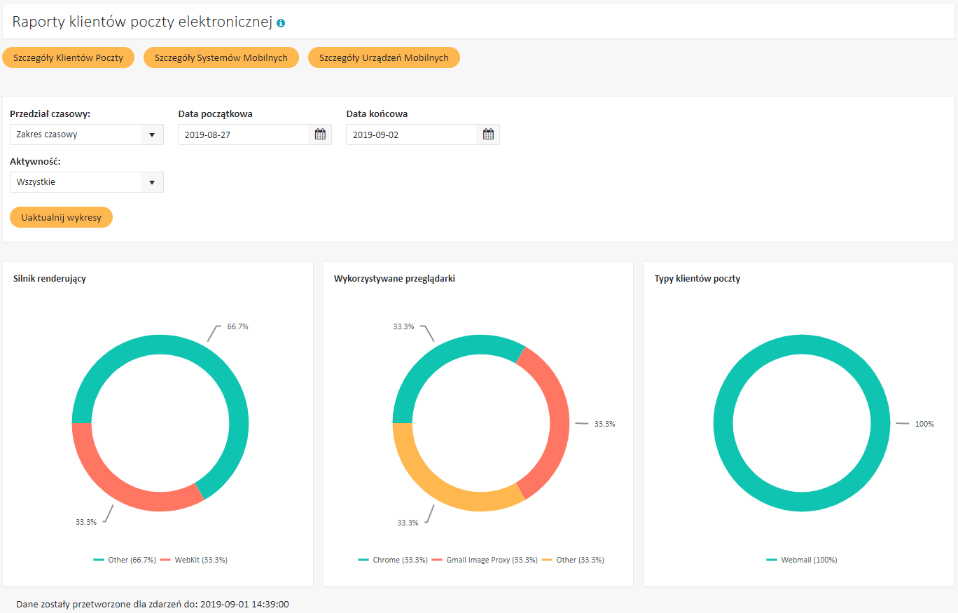 Podstawowy raport ukazuje trzy wykresy zawierające informacje statystyczne nt. silników renderujących używanych do renderowania Twoich wiadomości (Trident/WebKit i inne), przeglądarek, na których są otwierane (Chrome/Firefox/Safari/Internet Explorer/Edge i inne), i typ klienta (Webmail/Desktop/Mobile).