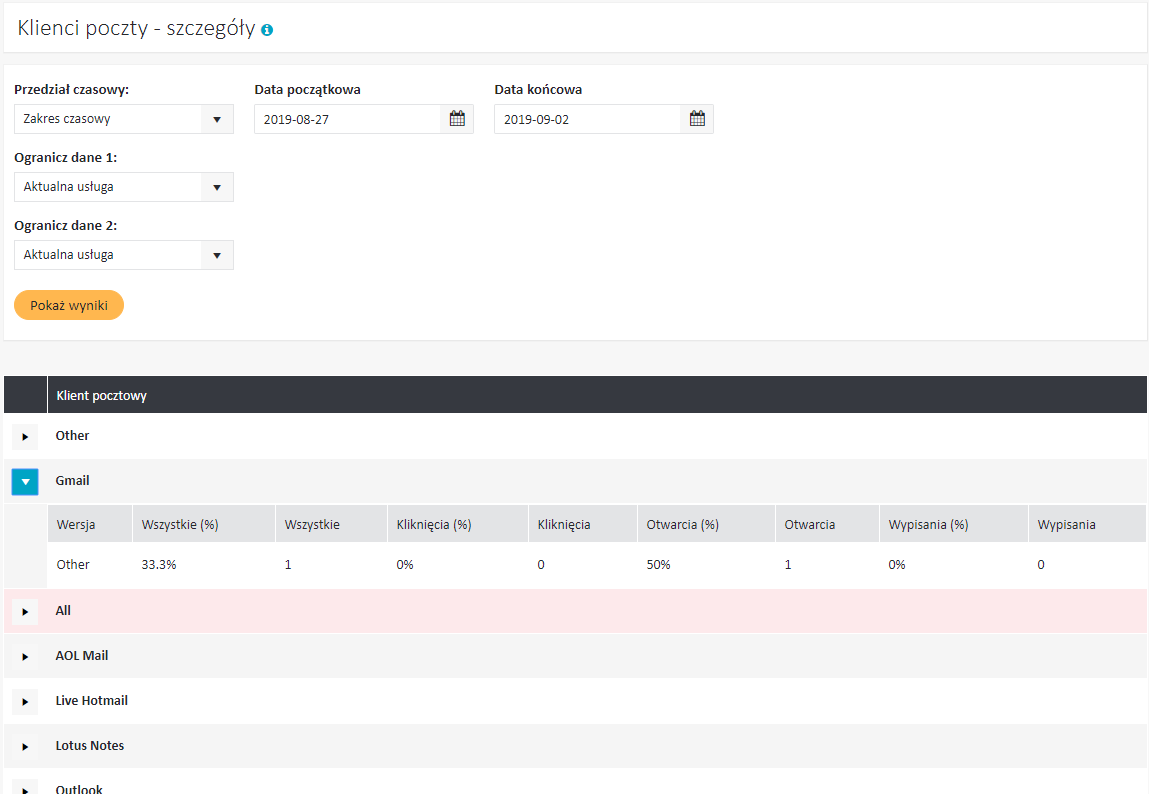 Możesz także otrzymać bardziej szczegółowe dane. W tym celu, kliknij jeden z przycisków u góry strony: Szczegóły klientów poczty, Szczegóły systemów mobilnych lub Szczegóły urządzeń mobilnych.