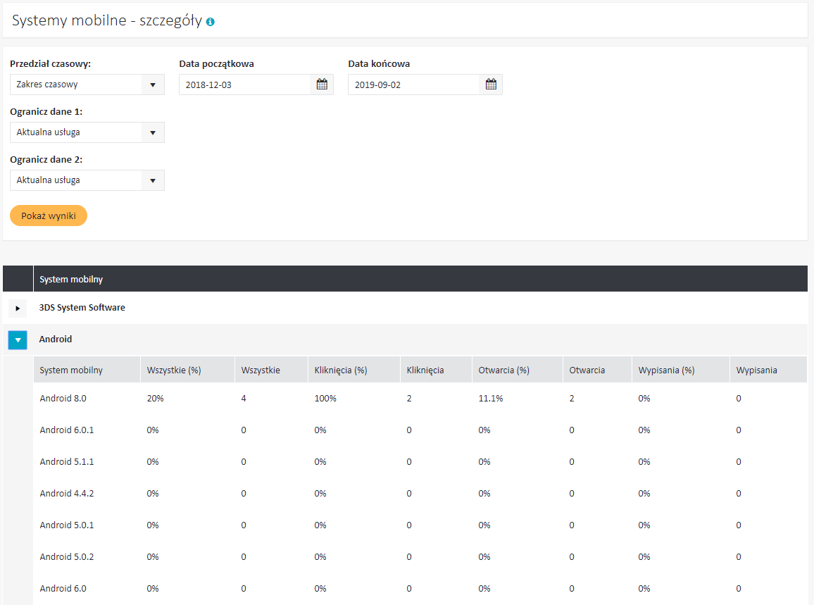 Tabela w Szczegółach systemów mobilnych zawiera statystyki dotyczące systemów operacyjnych urządzeń mobilnych, na których Twoje wiadomości są wyświetlane: