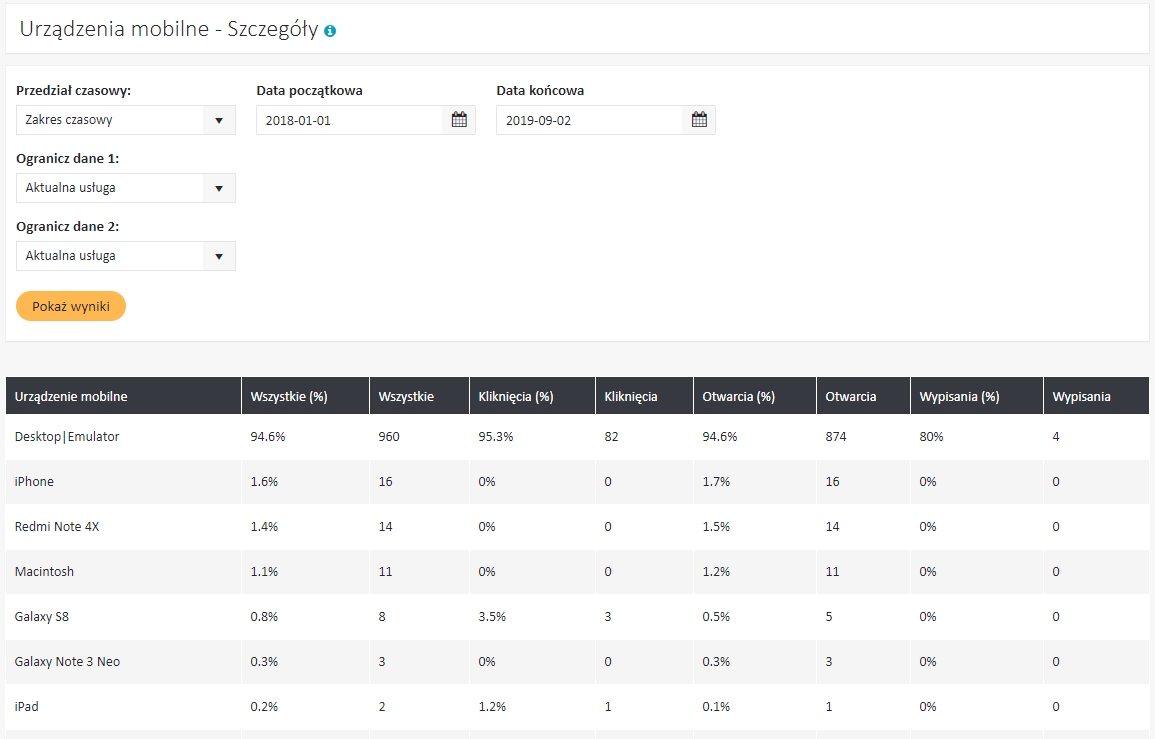 Tabela w Szczegółach urządzeń mobilnych zawiera dane o urządzeniach na których Twoje wiadomości były otwierane, wraz z informacją o częstotliwości, kliknięciach i wypisach mających miejsce na każdym urządzeniu.