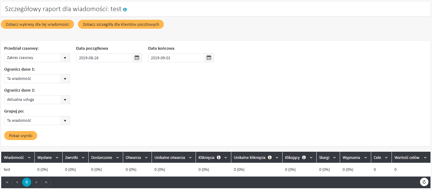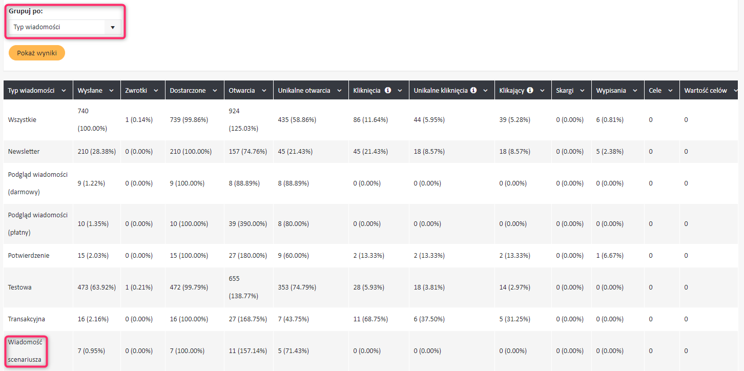 Innym sposobem sprawdzenia funkcjonowania Twoich scenariuszy jest użycie ogólnych raportów zbiorczych email. Z menu po lewej stronie wybierz Raporty > Zbiorcze Email, wprowadź zakres czasowy i ograniczenia danych. Następnie z rozwijanego menu Grupuj po wybierz Typ wiadomości. Tabela pokaże szczegółowe statystyki wszystkich Twoich wiadomości wysłanych w danym okresie pogrupowane po typach wiadomości (właczając wiadomości scenariusza).