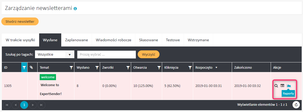 - Z menu po lewej stronie wybierz Raporty > Wiadomości Email. Pojawi się tabela ze wszystkimi wiadomościami email, które wysłałeś.