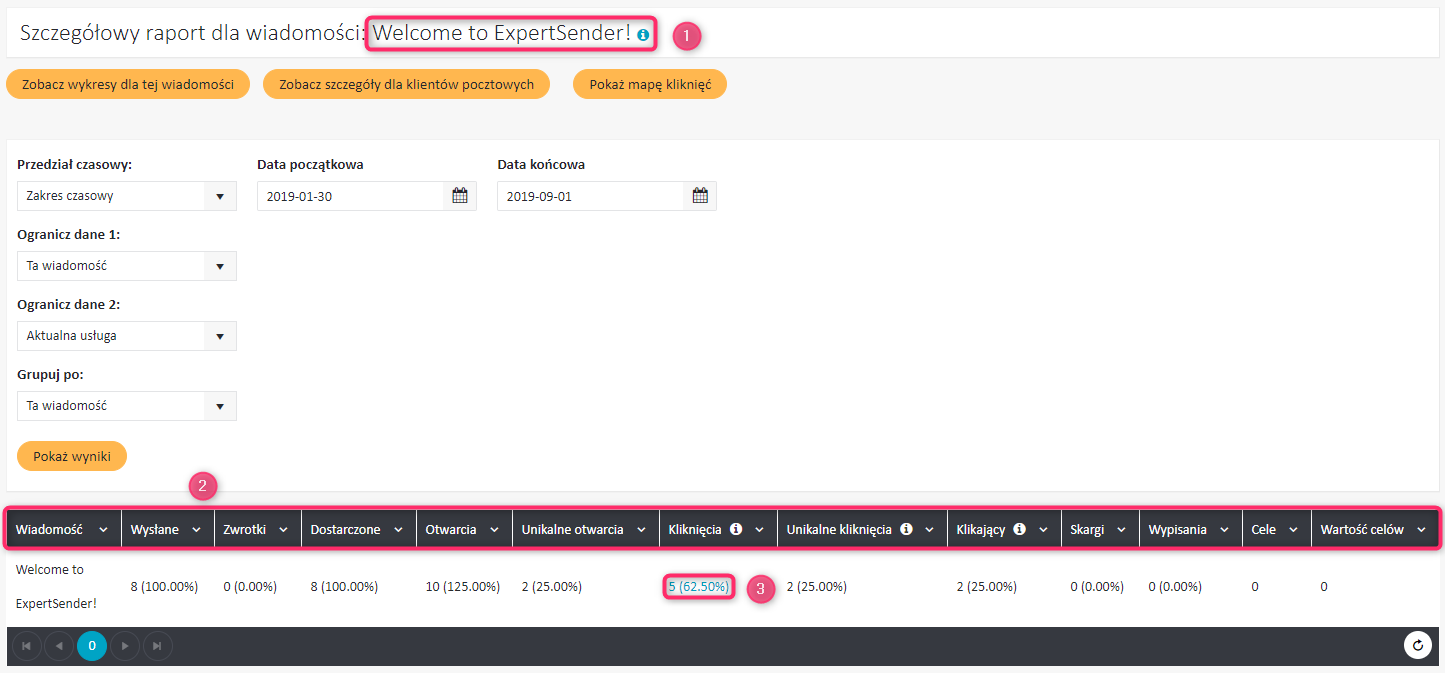 W przeciwieństwie do Raportu zbiorczego email, możesz kliknąć na wartość w kolumnie Kliknięcia (zob. (3) powyżej), by otrzymać więcej informacji o kliknięciach w wiadomości: