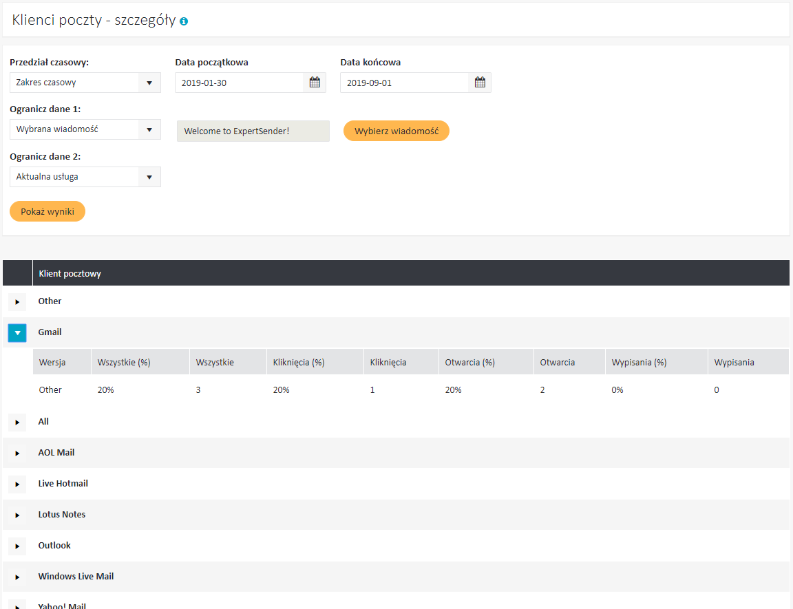By uzyskać dostęp do szczegółowych statystyk dotyczących klientów poczty użytych do otwarcia Twojej wiadomości, kliknij przycisk Zobacz szczegóły dla klientów pocztowych u góry. Pojawi się następujący widok: